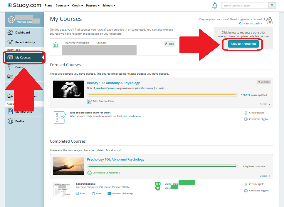 - On your Dashboard, go to the My Courses tab and click Request Transcripts (refer to the image above).